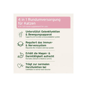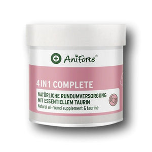 AniForte 4in1 Complete Cat ist mit wertvollen Naturstoffen, wie Kollagenpulver, Acai Pulver und Tobinamburpulver eine Rundumversorgung für Deine Katze. Das hochwertige Produkt liefert einen wertvollen Beitrag zur Unterstützung des Immun- und Herzsystems, des Bewegungsapparates und erhält zudem die Darmtätigkeit Deiner Katze.