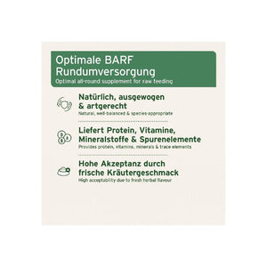Das leichtdosierbare Feingranulat kann einfach unter das tägliche Futter gemischt werden. Unser BARF Zusatz Pulver wurde nicht nur mit Blick auf die Gesundheit entwickelt, sondern auch darauf, den Gaumen Deines Hundes zu verwöhnen. Durch den unvergleichlichen Geschmack nach frischen Kräutern erfreut sich unser Produkt an einer hohen Akzeptanz.