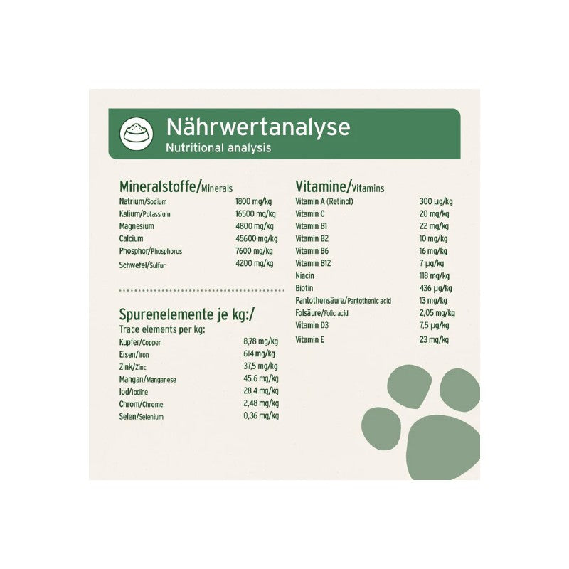 Das Produkt besteht zu 100 % aus natürlichen Rohstoffen wie Meeresalgenkalk, Malzkeimen, Bierhefe, Seealgenmehl, Leinsamenmehl, Eierschalen Pulver, Moringa sowie einer Kräutermischung mit Mariendistelfrüchten, Brennnesselblättern, Brombeerblättern, Kamille und Löwenzahnwurzel und eignet sich ideal als BARF Zusatz. Für eine Rundumversorgung Deines Lieblings empfehlen wir zudem die Fütterung von Knochen.