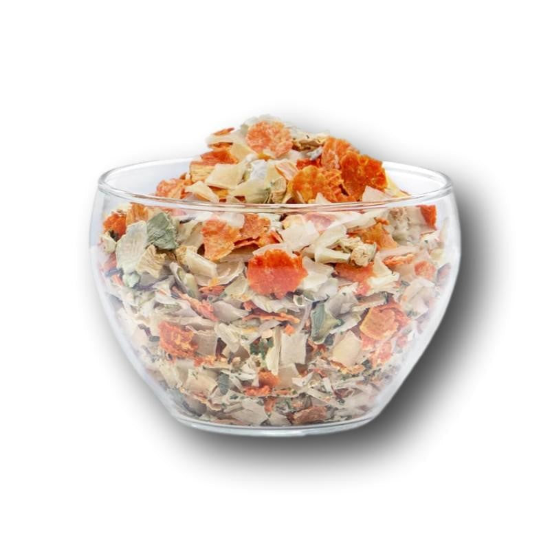 Die erlesene Kombination besteht aus Kartoffeln, Karotten, Zucchini, Erbsen, Petersilie, Löwenzahnkraut mit Wurzel und Porree. Durch die sorgsame Trocknung und luftdichte Verpackung werden die wertvollen, natürlichen Inhaltsstoffe von bestem Gemüse und natürlichen Kräutern geschützt. Zudem hält der Mix länger frisch und versorgt Deinen Liebling so mit wertvollen Nährstoffen.