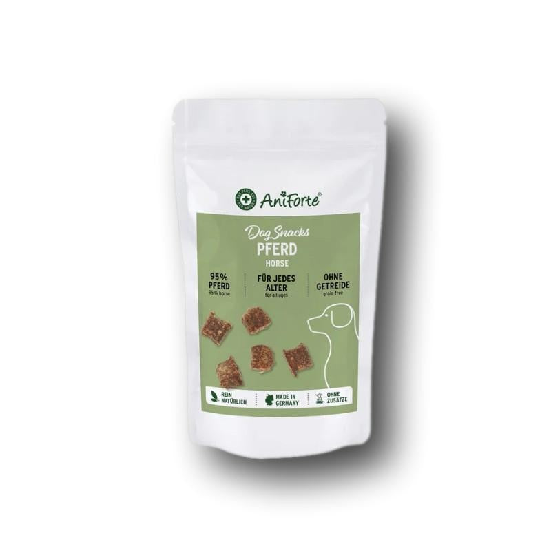 AniForte Dog Snacks Pferd liefern Deinem Vierbeiner Pferdefleisch als einzige Proteinquelle. Die Fleischwürfel sind frei von Zusätzen jeglicher Art und erfreuen sich aufgrund des intensiven Aromas einer hohen Akzeptanz bei Hunden.