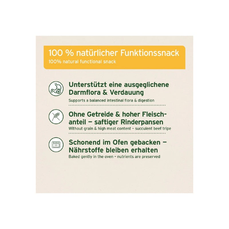 Eine fleischige Gaumenfreude: Wir setzen bei unserem Snack auf nur eine hochwertige Proteinquelle mit der Geschmacksrichtung Rinderpansen und das mit einem außerordentlich hohen Fleischanteil von 82,6 %.