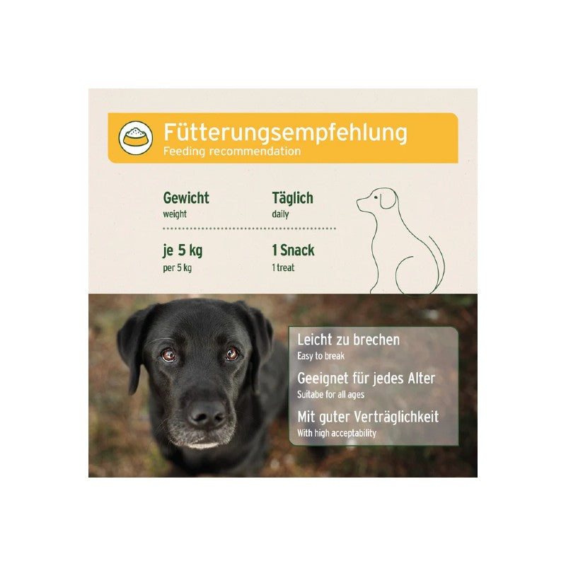 Die Snacks können einfach während des Spaziergangs, als Belohnung oder beim Training gegeben werden. Bitte immer ausreichend Trinkwasser zur Verfügung stellen.
