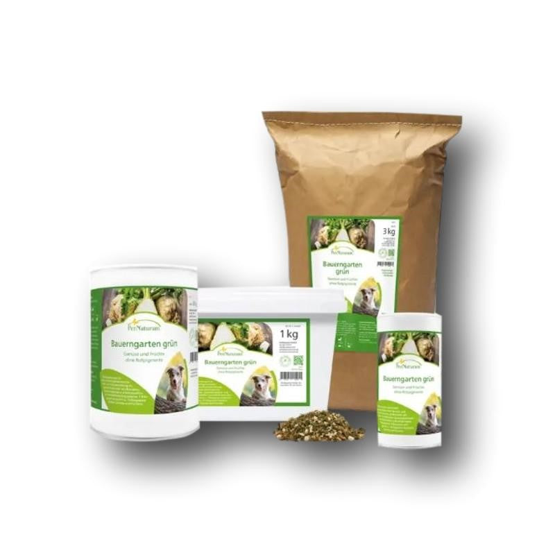 PerNaturam Bauerngarten grün liefert Mineralien, präbiotische Fasern und wichtige Ballaststoffe für die Verdauung.1 kg getrockneter Bauerngarten grün entspricht etwa 10 kg an frischen Gemüsen und Früchten.