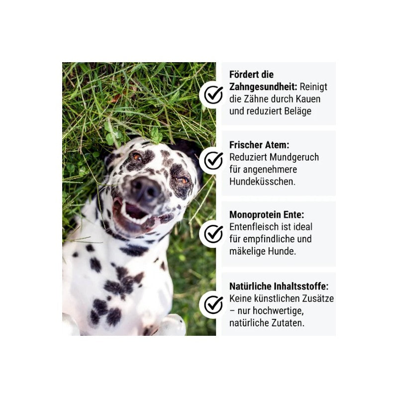 Tales & Tails Entelich Zähne zeigen sind echte "Knabberstars" für ein sauberes Gebiss! Mit feiner Ente als Monoprotein und hochwertigen, natürlichen Zutaten bleibt im Hundemaul EnteLich alles frisch und auch deine Nase findet das nächste Hundeküsschen ganz "dufte".